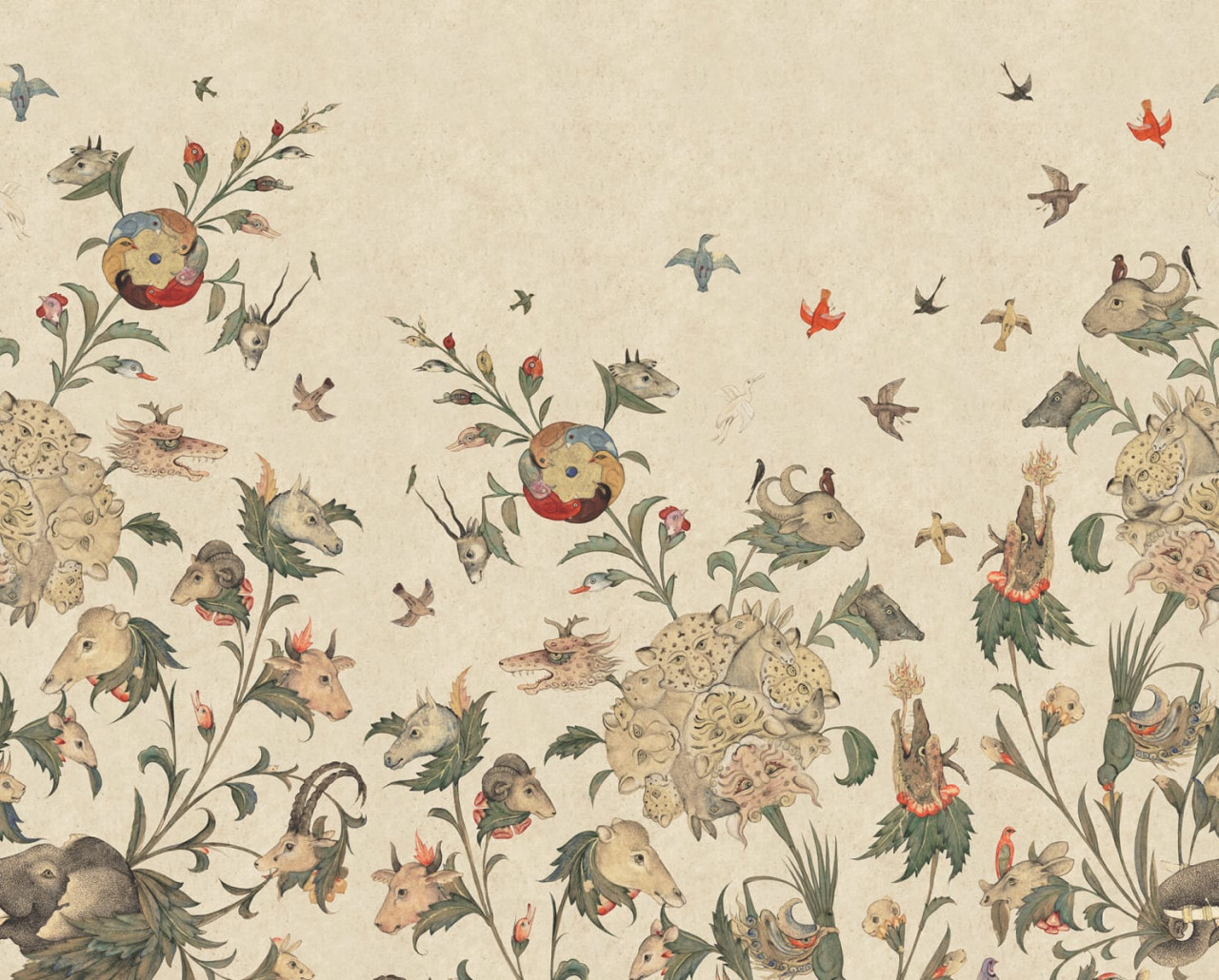 Quirky World, Night - un tapet extraordinar care combină frumusețea suprarealistă a plantelor cu cap de animal și grația păsărilor ce zboară pe un fundal deschis captivant.
